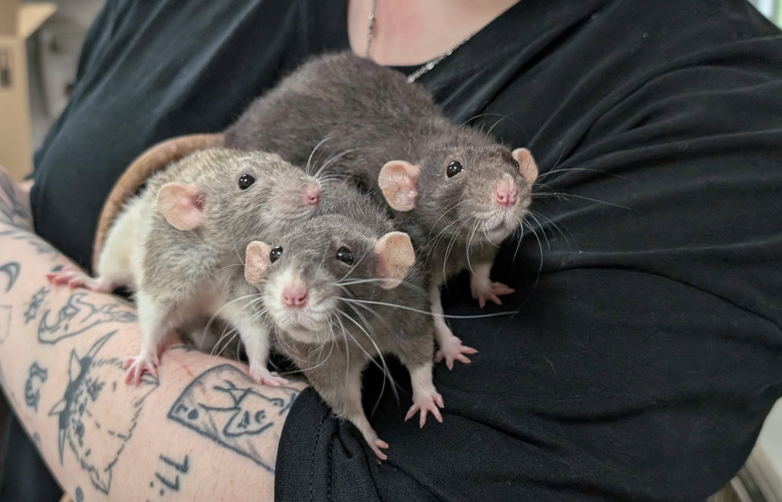 Ces trois adorables rates femelles ont 1 an et demi et attendent leur foyer pour la vie ! Très gentilles, curieuses et sociables, elles sont toutes aussi attachantes les unes que les autres.