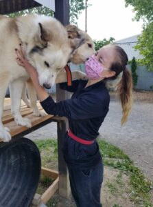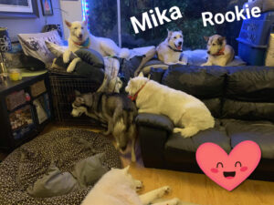 They arrived at the shelter owner’s house with several other dogs! That same evening, we saw in the photos Rookie giving kisses to the gentleman and the 2 surrounded by the other huskies in the house. What a relief to finally see them in a home that will go at their pace.